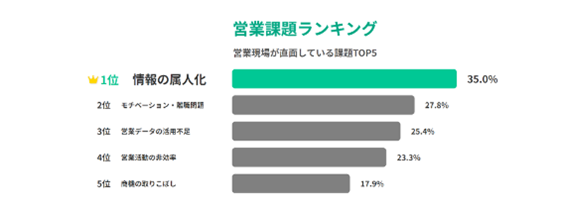 調査では、「あなたが営業をする上で、または営業組織をマネジメントする上で、感じる課題は何ですか?」という質問に対し、最も多かった回答が「情報の属人化・ブラックボックス化」(35.0%)でした。