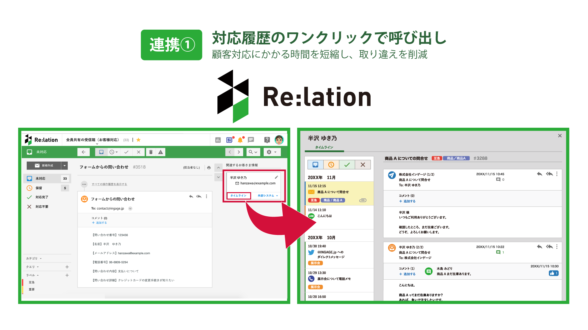 『Synergy!』のフォームに入力された問い合わせ者との対応履歴を『Re:lation』のタイムラインからワンクリックで確認できるようになりました。