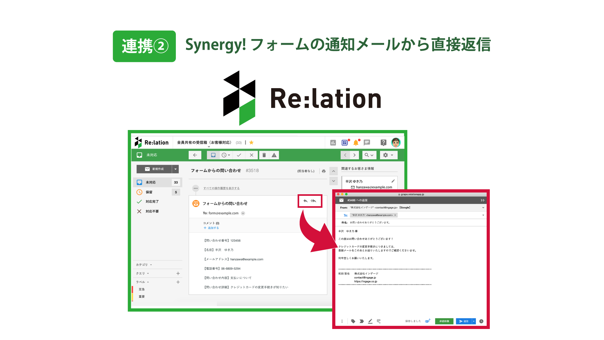 株式会社インゲージ(本社:大阪府大阪市、代表取締役:和田 哲也)の提供する、問い合わせ対応コミュニケーションクラウド『Re:lation (リレーション) 』と、シナジーマーケティング株式会社(本社:大阪府大阪市、代表取締役社長:田代 正雄)の提供する、クラウド型CRMサービス『Synergy!』が連携をいたしましたことをお知らせします。