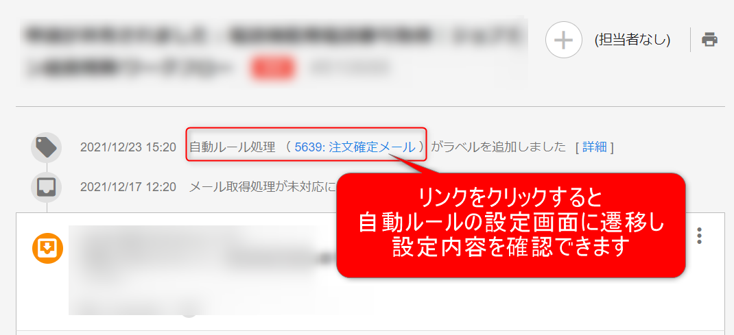 メッセージエクスポート機能の詳細については『メッセージと応対メモをエクスポートには(CSV形式)』をご確認ください。 - 受信したメールに自動ルールが適用されていた場合に、チケット詳細画面の「すべての操作履歴を表示する」から適用されている自動ルールのリンクから、自動ルールの設定画面に遷移できるようにしました。