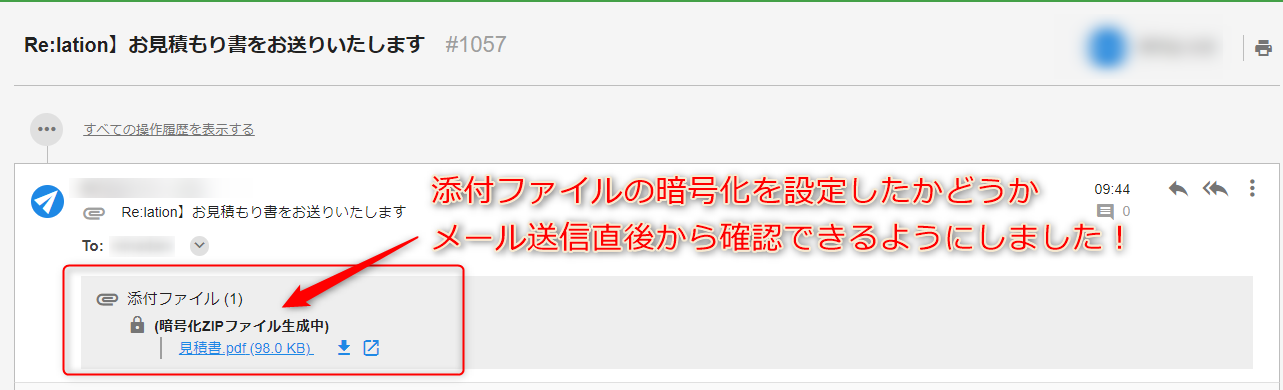 暗号化ZIP機能では、これまでメール送信直後には添付ファイルの暗号化を設定したかどうか確認できませんでしたが、今回のアップデートよりメール送信直後から確認できるようにしました。