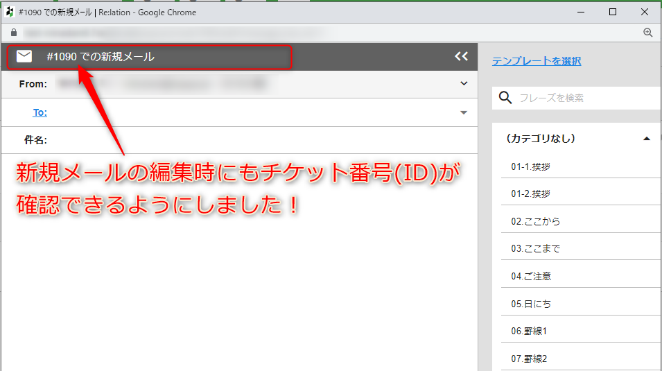 これまでは新規メールの編集時はヘッダーにチケット番号(ID)が表示されませんでしたが、今回のアップデートよりチケット番号(ID)をヘッダーに表示するようにしました。